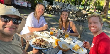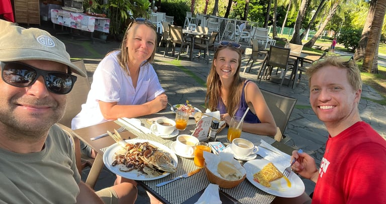 After all that chaos and color, our stomachs reminded us it was time for breakfast. We wandered over to a little restaurant near the airport marina with a wonderful view over the water. The menu wasn’t the most self-explanatory, so we had to guess a little. My mom and I took a chance on a tuna coconut salad. Luckily, it turned out delicious. Alex had an omelet. My dad, meanwhile, bravely asked for fish… not realizing they’d take him to pick his own, fresh, whole fish. Next thing we knew, a fully fried fish, head and all, landed on his plate, staring up at us with crispy eyes. It was apparently great, though maybe more lunch than breakfast.