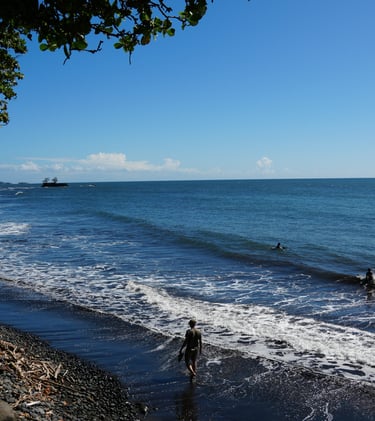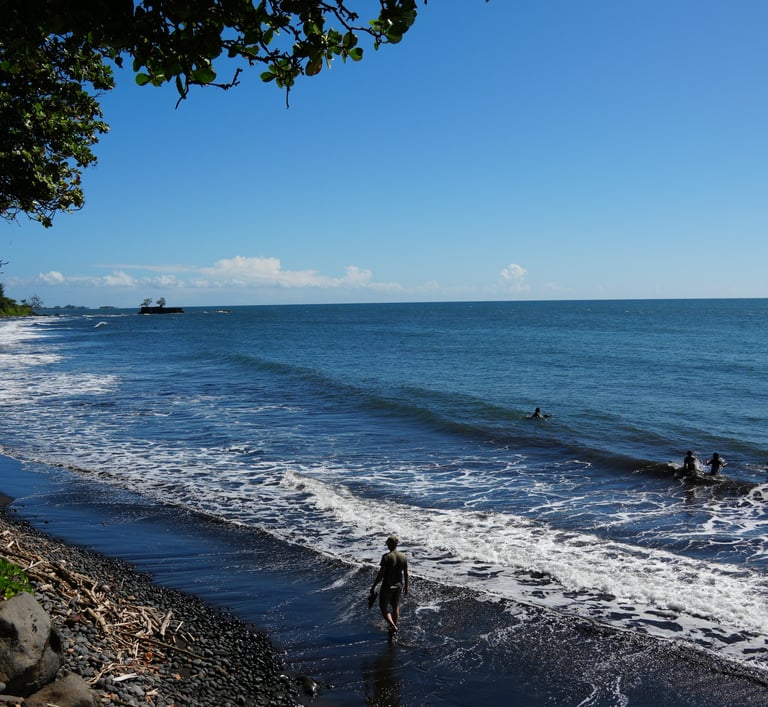 After breakfast, we drove westward along the coast, passing lush green hills and postcard-perfect beaches. Our goal: a waterfall we’d read about. Eventually, we pulled into a tiny local parking area where fruit stands popped up like they knew we were coming. After crossing a narrow little bridge, we heard it before we saw it, that deep, roaring sound of falling water. And then, there it was: a majestic waterfall, framed by wild green, mist in the air. The kind of place that makes you pause and just feel the moment.