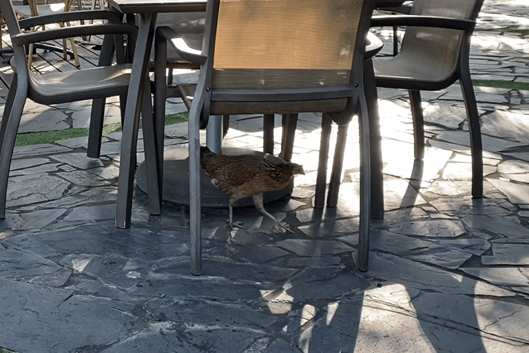 As we ate, chickens and roosters paraded around our feet, clearly hoping for scraps. One of them even tried to hop onto a nearby chair like it had a reservation.