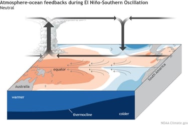 Normalerweise ist diese Region von beständigen Passatwinden geprägt, die von Ost nach West wehen. Sie schieben warmes Oberflächenwasser in den westlichen Pazifik und ermöglichen gleichzeitig das Aufsteigen kühler Tiefenwasser an der Küste von Peru und Ecuador, das als Auftrieb bezeichnet wird.. Doch diese Passatwinde und die Strömungen, die sie antreiben, sind nicht konstant. Alle 2 bis 7 Jahre gerät das System aus dem Gleichgewicht und wechselt in eine von zwei deutlich unterschiedlichen Phasen: El Niño oder La Niña.