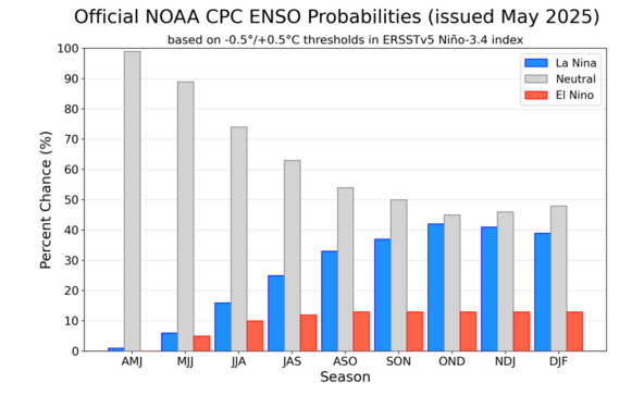 Im Juni 2025 prognostiziert das NOAA Climate Prediction Center mit hoher Wahrscheinlichkeit (82 %), dass der tropische Pazifik während des Sommers 2025 und bis Anfang 2026 im ENSO‑Neutralzustand bleiben wird.