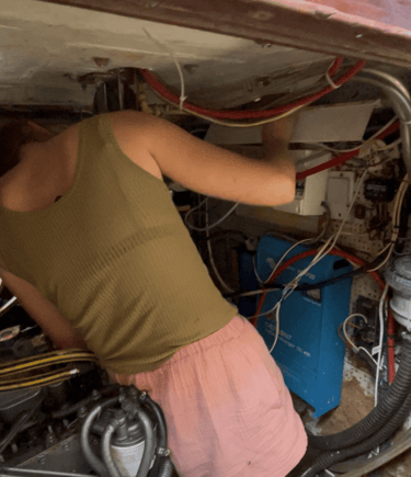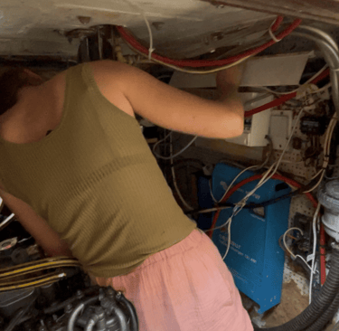 Wir haben zwei Bilgepumpen, eine kleine und eine größere. Also teilten wir uns auf: Alex machte sich an die Pumpen, testete sie, ersetzte korrodierte Verbindungen. Ich hingegen begann, den Kabeln zu folgen, eine wahre Detektivarbeit, denn viele verschwinden in Wänden oder laufen gebündelt durch enge Kabelkanäle. Neben den Pumpen gibt es auch zwei Wassersensoren: einen Kippschalter, der bei Wasser in der Bilge aufschwimmt und die Pumpe aktiviert, und einen elektronischen Sensor an der oberen Kante der Bilge, der bei Kontakt mit Wasser ein lautes Warnsignal durchs Boot jagt.