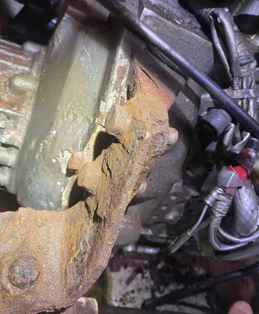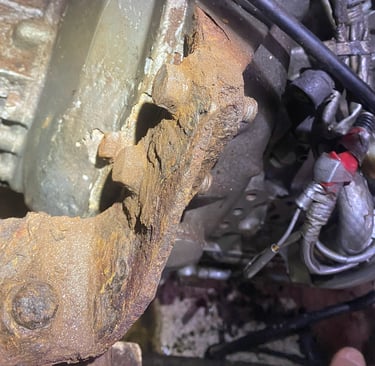 Dieses Lager war mit einem Flansch direkt am Motor befestigt. Zwei Schrauben mussten gelöst werden, eigentlich kein Problem, dachten wir. Doch der ganze Bereich war unter einer dicken Schicht aus Rost und Dreck begraben. Wir versuchten, alles mit Hammer und Meißel freizulegen, um überhaupt an die Schrauben heranzukommen. Die Schraubenköpfe waren so verrostet, dass man kaum einen Schraubenschlüssel ansetzen konnte, und sie bewegten sich keinen Millimeter.