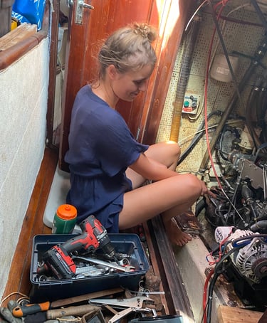 Nach dem Zähneputzen, einem kurzen Guten Morgen an die Schildkröten und dem kleinen Frühstück starteten wir direkt in den Tag. Heute wollten wir die letzten beiden Motorlager wechseln. Gestern war alles gut gelaufen, also banden wir den Motor wieder über die Ösen ab und Alex begann mit dem hinteren Lager auf der Backbordseite.