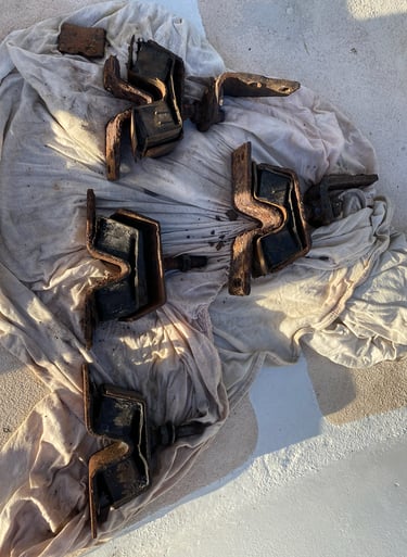 Als ich ihn ablöste, arbeitete ich weiter an dem Schraubenkopf. Es war zäh und ich begann, über Alternativen nachzudenken. Um die Ankerschraube freizubekommen, sägte ich ein Stück des Lagers ab, der Teil, der verhinderte, dass man sie nach oben herausdrehen konnte. Nach einer weiteren halben Stunde war es geschafft. Die Bolzen waren draußen. Ich schlug mit dem Hammer gegen den Flansch und wie durch ein Wunder löste sich die untere Schraube. Da wir so oft darauf gehämmert hatten, waren die Gewinde am Ende beschädigt. Ich nahm eine Feile und formte das Ende zu einem Bolzen. Und tatsächlich, endlich kam die Schraube heraus. Was für ein Glück.