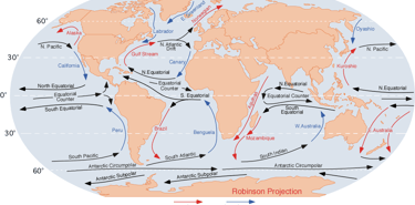 Äquatoriale Strömungen: Entlang des Äquators befinden sich zwei westwärts fließende Strömungen (Nord- und Südäquatorialstrom) sowie dazwischen der ostwärts gerichtete Äquatoriale Gegenstrom. Dieser Gegenstrom kann überraschend stark sein und wird häufig beim Segeln ostwärts über den Pazifik oder Atlantik genutzt.