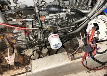 Kurz erklärt: Der Motor ist mit vier Metalllagern am Boot befestigt, die jeweils einen Gummikern haben, um Vibrationen abzufangen. Unsere waren alt, angerostet und spröde. Auf unserem letzten Törn hatten wir eines Morgens festgestellt, dass sich der Motor komplett verschoben hatte und fast in die Bilge gefallen war. Das Metall hatte sich vom Gummi gelöst, sodass der Motor nicht mehr richtig mit dem Boot verbunden war. Bevor wir den Motor also wieder starten konnten, mussten die Lager unbedingt ersetzt werden.