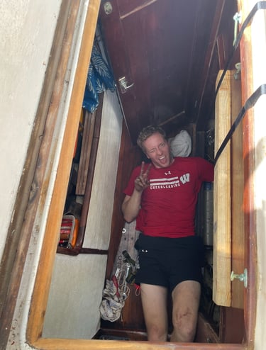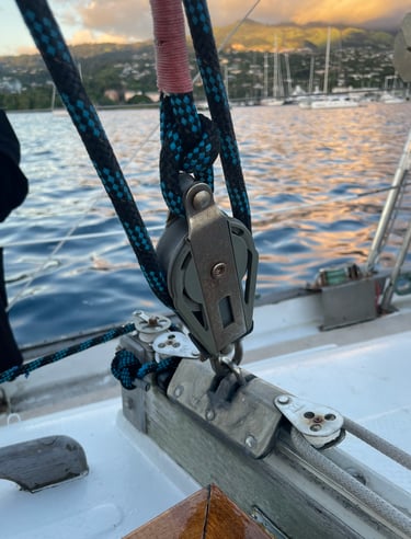 Während Alex sich darum kümmerte, schaute ich mir den Traveller an – das Bauteil, mit dem das Segel zwischen Backbord und Steuerbord hin- und hergeführt wird. Die Rollen dafür waren komplett hinüber, sie mussten auf jeden Fall ausgetauscht werden. Also nahm ich den ganzen Traveller auseinander, um zu sehen, wie wir ihn reparieren könnten. Ich hatte zwar kleine Ersatzrollen mitgebracht, aber sie passten leider nicht. Also verschob ich das Problem vorerst. Vielleicht würden wir an Land Ersatzteile finden.