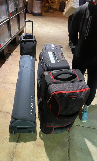 The luggage this time is a very interesting mix of things. One carry on contains, among other things, an AIS system and a brand new VHF radio. One overweight bag is packed with an impressive amount of new rope. Another overweight bag holds a full man overboard safety setup, including life vests, hoisting systems, and jacklines. Basically everything you hope to never need, but absolutely must have. A third bag carries our new radar. And finally, the most confusing bag of all, an oversized monster stuffed with wall and countertop material, as well as fishing poles.