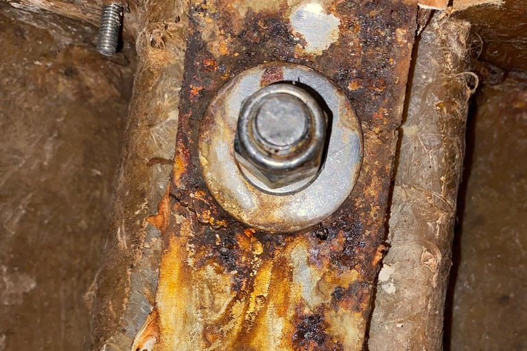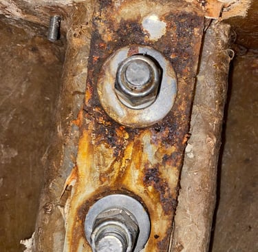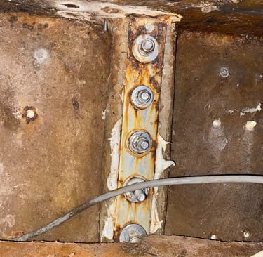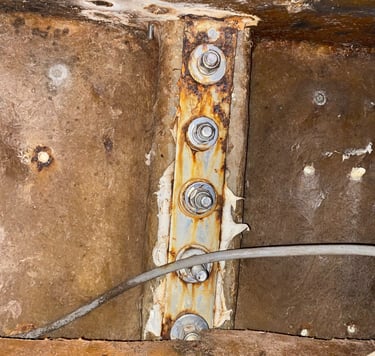 The backstay chainplate, the metal anchor point that holds the wire stabilizing the mast, was rusted through at the very first bolt. Fully broken. Sailing with that? Out of the question. My heart dropped. Suddenly I was panicking about the other chainplates too. There are six more along the sides of the boat, three on each side. If those were also rusted? We’d be in real trouble. To check them, we had to dismantle the back walls of the closets in the saloon. My nerves were through the roof while unscrewing those panels. But...relief. Twenty minutes later, we had our answer. All of the side chainplates looked solid. Clearly replaced at some point. It was just the backstay chainplate that had failed. Still, it was a big problem.