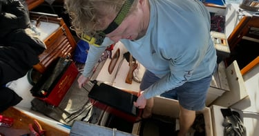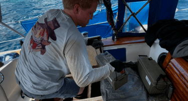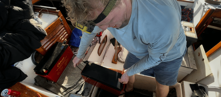 With spirits lifted, we drove back to the marina and began the next challenge: installing the batteries. First, we dinghied out to Tauha to remove the old ones. Alex did most of the heavy lifting, literally. He disconnected the dead batteries, hoisted them out of the boat, and somehow managed to get them into the dinghy. I had trouble just lifting one; how he balanced them while the dinghy rocked, I don’t know. Two of the gel batteries were visibly broken. The third looked okay… until we tested it. Also dead. We brought them to the marina’s disposal station, then loaded the new batteries into the dinghy, wrapped in trash bags for splash protection, and headed back out. Alex started lifting them onto the boat. And during battery #2, I had a flashback to my first-night luggage incident. Sure enough, when he pushed the second battery up, the dinghy slid back. The battery was hanging halfway off the boat. With one final push, he got it on safely. After that, he agreed to tie the back of the dinghy to the boat, too. Lesson learned.
