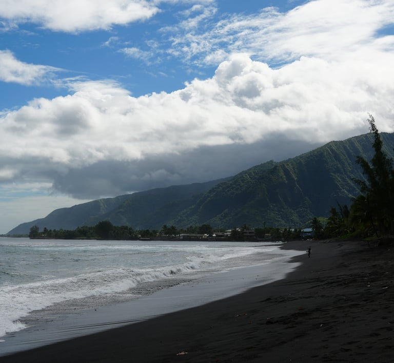 It’s a beautiful drive across Tahiti. What’s wild is how our side of the island always seems to be drenched in sunshine, and then, just a few kilometers inland, rain. And just like clockwork, as we got closer to the metal workshop, the sky opened up and poured down on us. But even in the rain, this side of the island is stunning, towering green mountains, thick jungle, wild beauty everywhere. It’s hard not to fall in love with it.