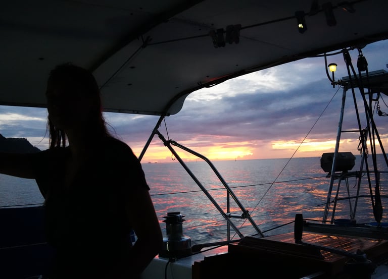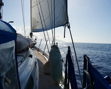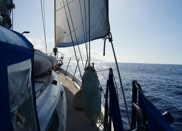 There was almost no wind, but a stubborn swell rolled in nonstop. My dad, feeling queasy, went below to try and sleep it off. I wasn’t much better (still working on my seasickness game), but stayed up top with my mum, managing sails, switching the engine on and off, adjusting course and repeatedly turning around only to see… the island still exactly where it was.